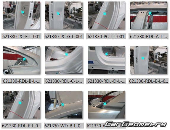 Information for the VW Arteon 2017-2025 body geometric dimensions, control points, images of body elements, materials used, recommendations on applicable types, methods and materials for the welding points; places and materials for applying seam, soundproof and anti-corrosion sealants; points and directions for pre-cuts of body parts for the future installation of the new ones; types of interior materials, definitions and decoding.